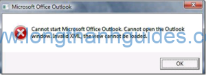 Cannot start Microsoft Outlook. Cannot open the Outlook window. Invalid XML, the view cannot be loaded.